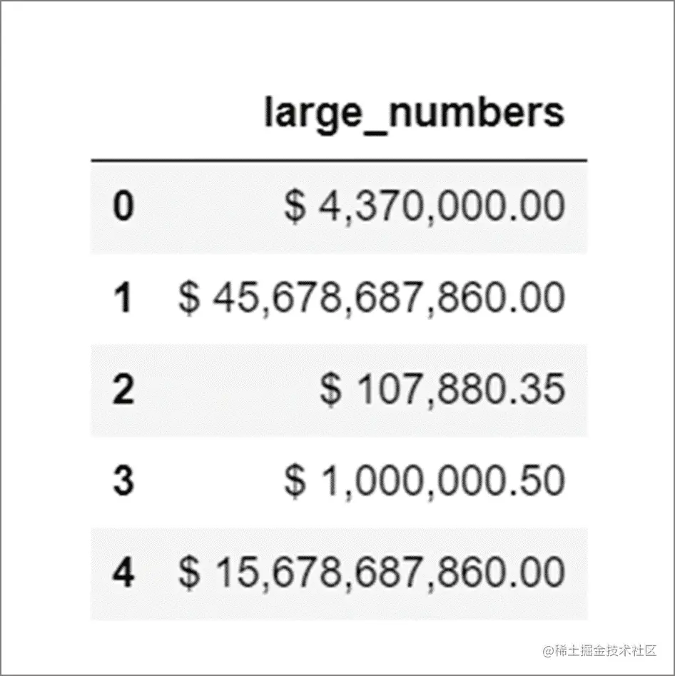 我们甚至可以添加货币符号在数值前面,比如我们把 display.float_format 设置为 "$ {:,.2f}".format,得到如下结果: