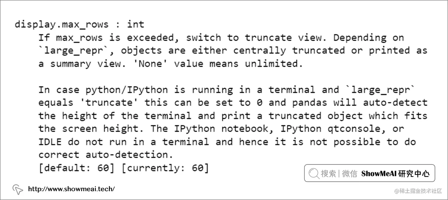 针针对某个特定的显示设置,可以在 pd.describe_option()中传入想调整的显示设置名称来获取使用细节,例如我们运行pd.describe_option("max_rows")将打印描述 display.max_rows使用细节,如下图所示。