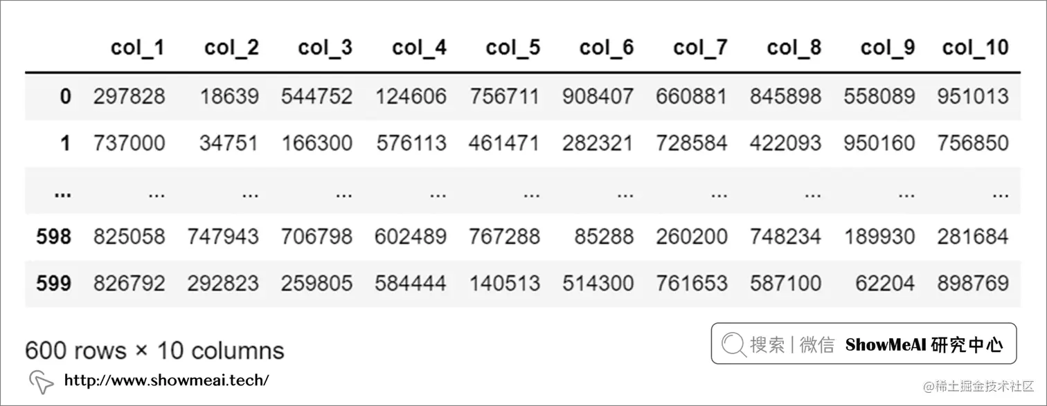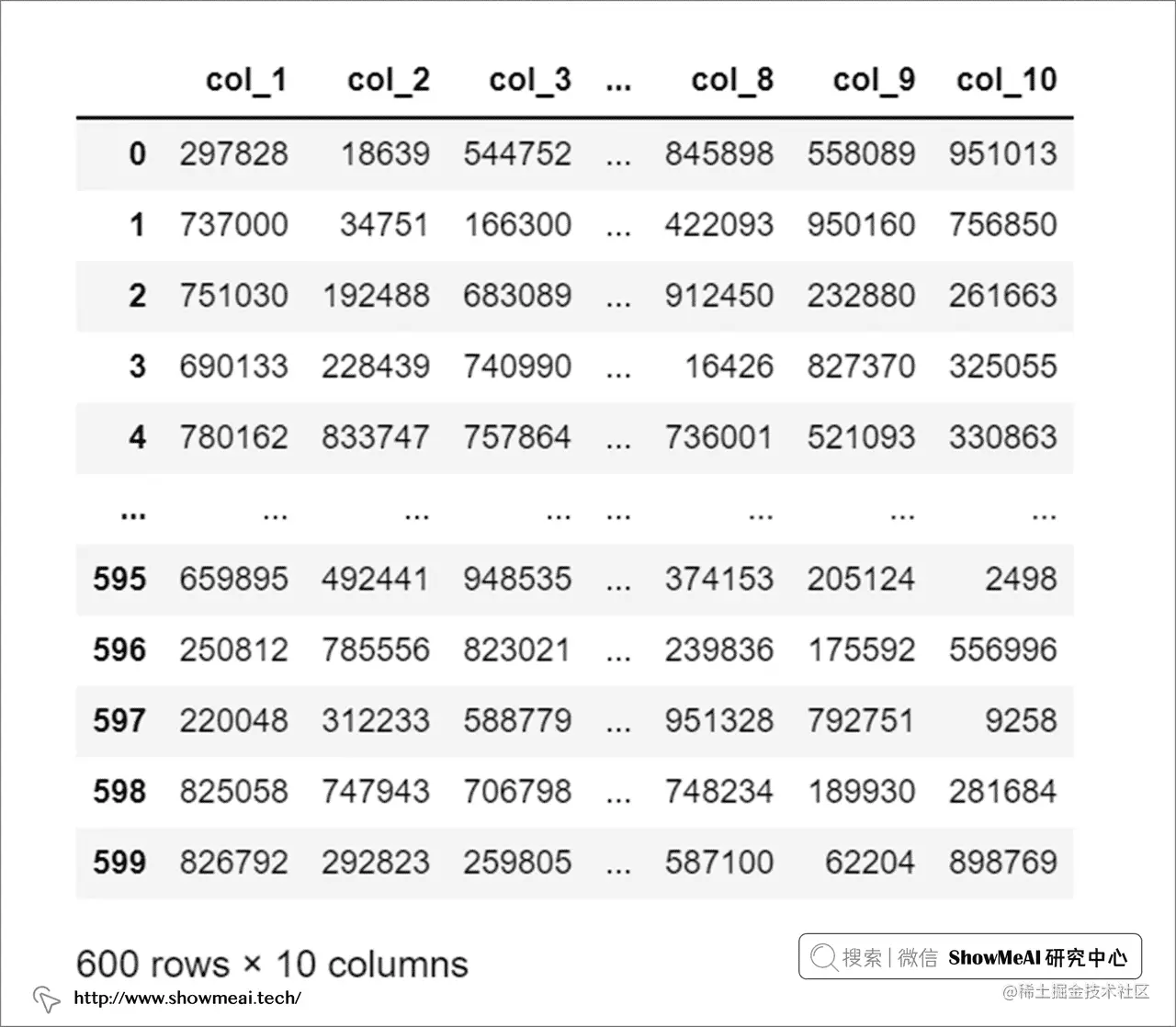 打印大 Dataframe(行列数很多的数据)时,Pandas 默认显示前 5 行和后 5 行,如下图所示。