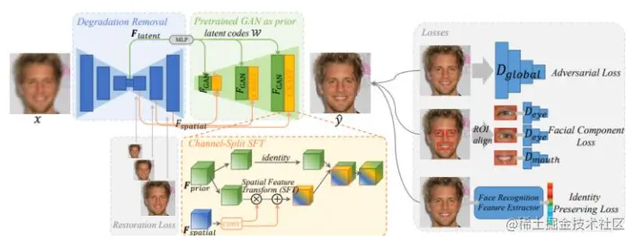 两个模块通过基于通道分割的空间特征转换 (CS-SFT) 方式连接,去退化模块将潜在特征映射至预训练的 StyleGAN2 的潜在特征空间,多分辨率特征从粗到细地调制 StyleGAN2,损失函数除了传统的对抗损失之外,还添加了面部组件损失、身份保真损失、去退化模块重建损失。