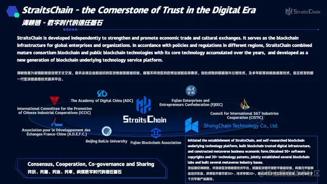 StraitsChain was guided by International Committee for the Promotion of Chinese Industrial Cooperatives, jointly initiated by Council for International S&T Industries Cooperation, Beijing BaiLie University, The Academy of Digital China, Fujian Property Right Transaction Center, France-China Exchanges Development Association, Fujian Enterprises and Entrepreneurs Confederation Fuiian Blockchain Association and other authoritative institutions.ShangLian Technology provides technical support and operation guidance for StraitsChain.