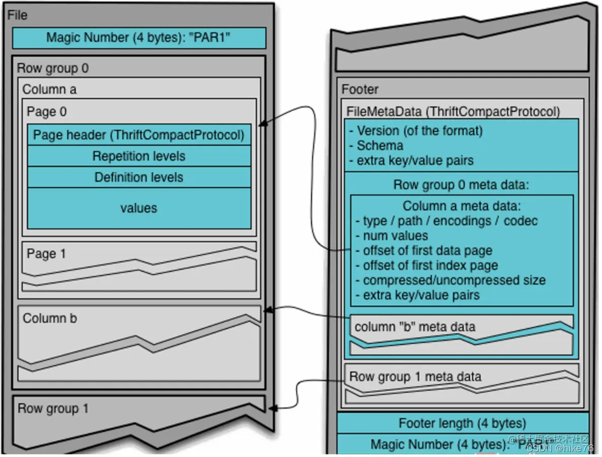 列块(Column Chunk):在一个行组中每一列保存在一个列块中,行组中的所有列连续的存储在这个行组文件中。一个列块中的值都是相同类型的,不同的列块可能使用不同的算法进行压缩。