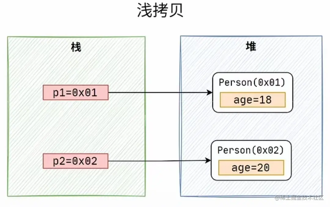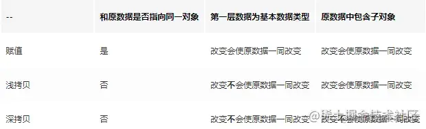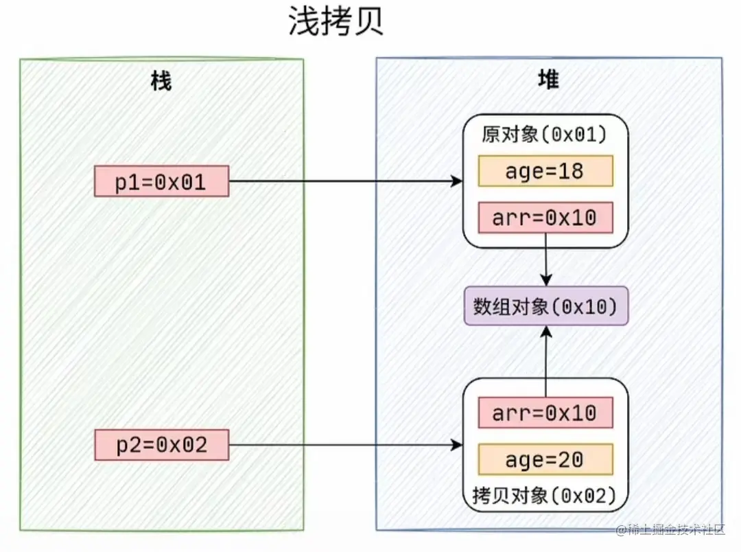 - 如果属性是引用类型,拷贝的就是内存地址,所以如果其中一个对象改变了这个地址,就会影响到另一个对象。