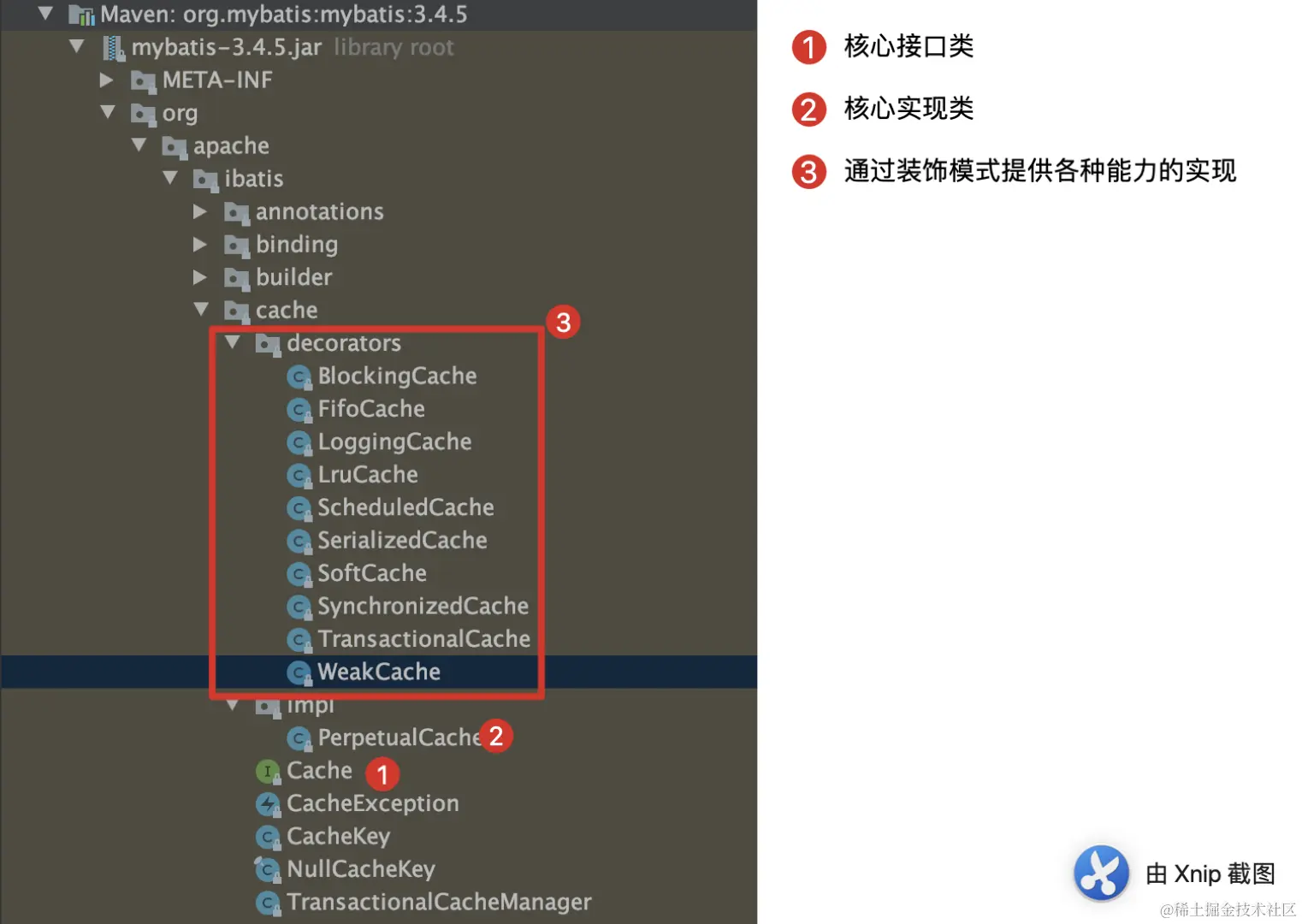 设计要面向接口设计,而不是具体实现。 这样当我们要重写 Cache ,比如说我们不想底层用 HashMap 来实现了,其实我们只要实现一下 Cache 接口,然后替换掉PerpetualCache就可以了。对于使用者其实并不感知。