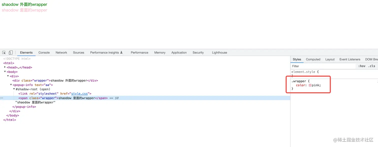 一个容器的内容是 shadow 外部 ,通过原生方法创建。他会引用 index .css。元素上面也有一个叫 wrapper 的 className。
