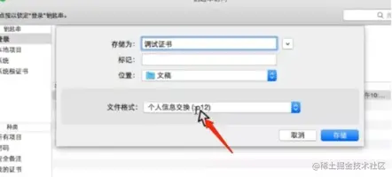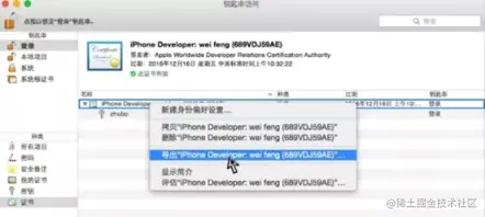2.证书的导出如果开发者电脑换了或者增加开发者,需要将证书授权给别的开发者 p.12 文件,就是授权文件,流程如下:1))找到钥匙串 找到对应 p12 文件,选择导出 2))导出时,需要输入一个密码,起一个有意义的名字 3))其他开发者安装完 p12 证书,描述文件,便具有了测试打包的能力