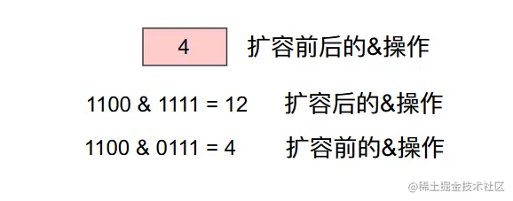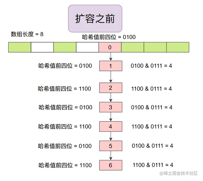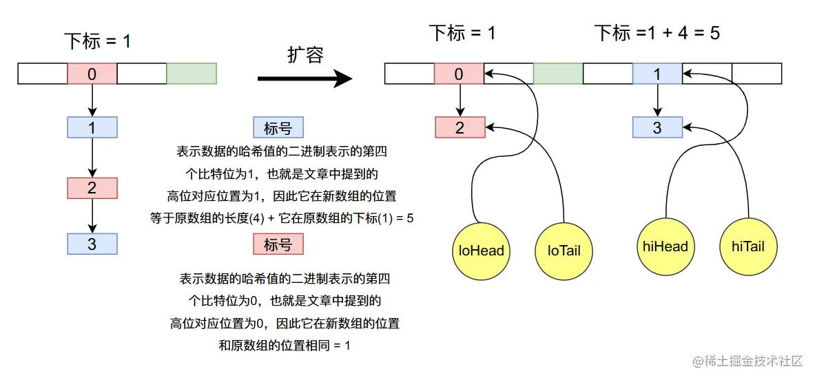 从上图我们可以发现扩容前后与key的哈希值进行&操作的数据的二进制数只是在高位增加了一个1,因此我们直接将原数组的下标加上这个高位1对应的10进制数(这个十进制数对应就是原数组的长度)就得到的数据在新数组的下标。而如果哈希值的二进制表示当中相应的高位的比特值为0,那么扩容前后他在数组当中的位置是没有发生变化的。