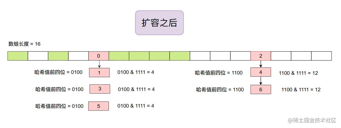 在扩容之前数组的长度等于8,那么乘以2倍扩容之后,数组的长度应该变成16,而且链表当中的数据需要进行重新&的操作,再将其放在新的数组当中,扩容重新进行&操作之后数组的情况如下图所示: