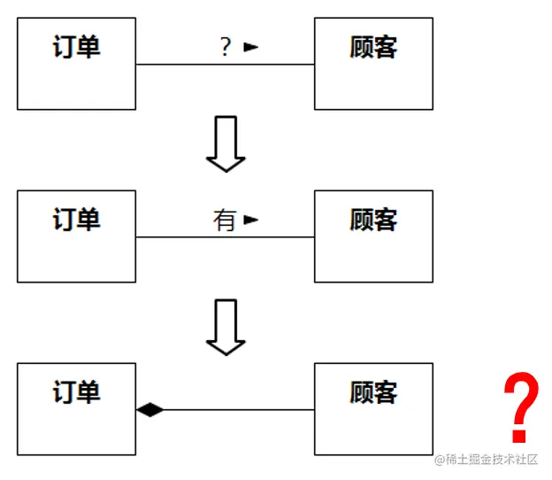如图8-126,如果建模为普通关联,还得给关联想个合适的名字。算了,懒得想,貌似说“订单有顾客”也说得通嘛,“有”那不就是组合(聚合)吗?干脆加个菱形吧,这样还省事,而且相对于一根直线,菱形让人有高大上的感觉!