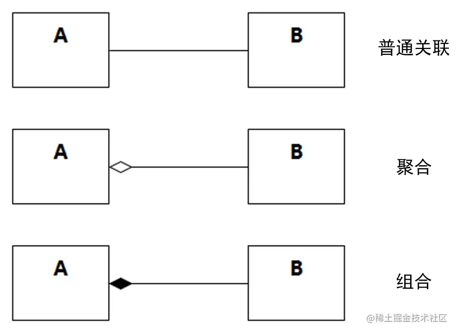 UML规范采取的是中间路线,把关联分为三种:普通关联、聚合(Aggregation)和组合(Composition)。