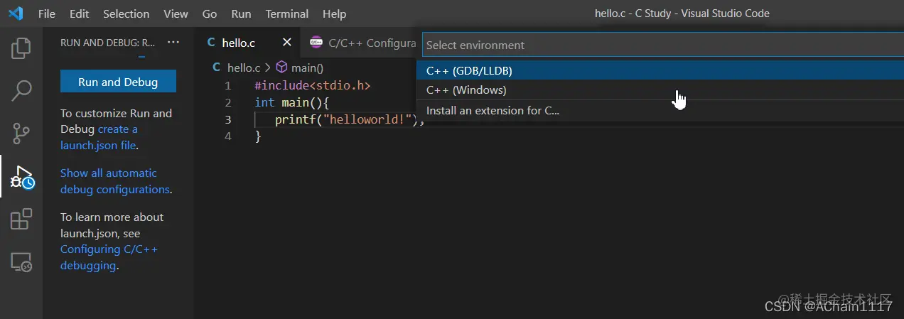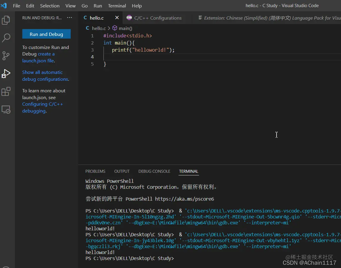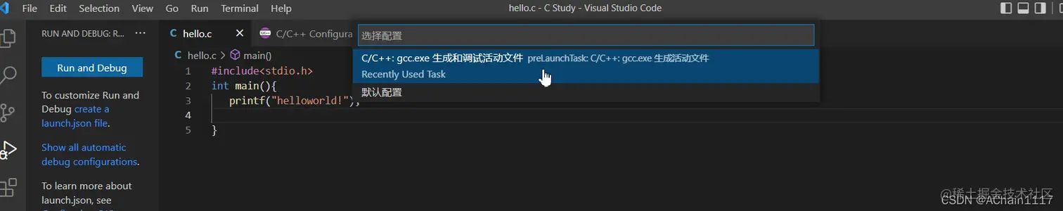 - 再将最开始创建的C语言文件夹完善,点击最左侧中的run选项运行,选择第一个选项