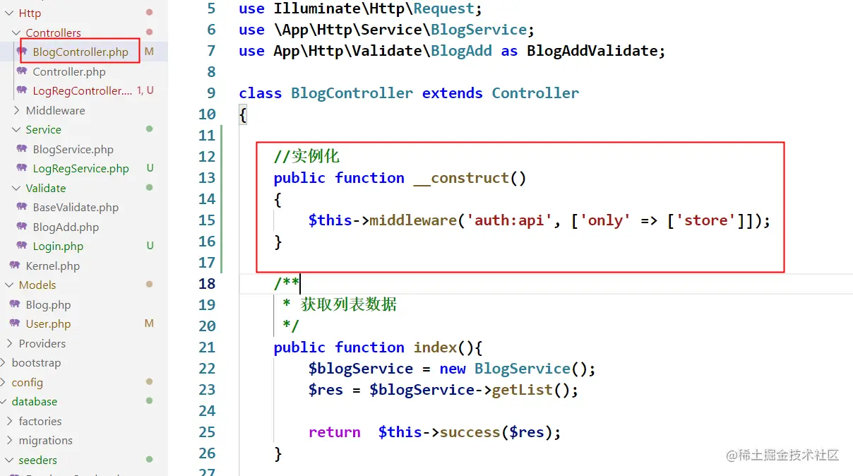 在文件 app\Http\Controllers\BlogController.php 的构造方法中配置中间件拦截。 意思是给 只给 store 方法添加 auth 的 api 权限拦截。