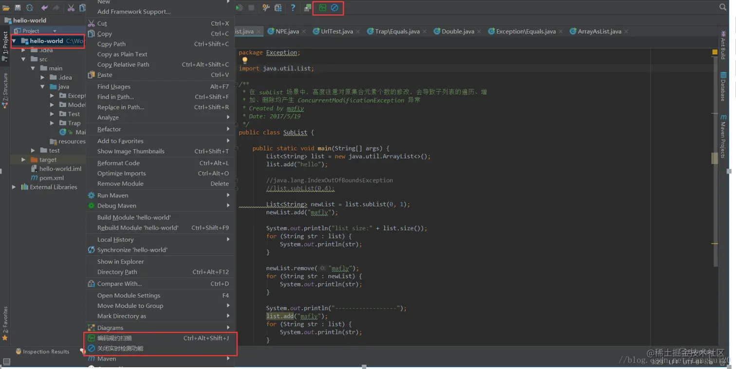 2、重启后就可以在你的项目上点击右键进行使用了,当然菜单栏也会出现俩按钮,它有个快捷键是Ctrl+Shift+Alt+J 。 选中某一个类,或者在这个类里边右键也可以,或者选择Tools >> 阿里编码规约 >>编码规约扫描.