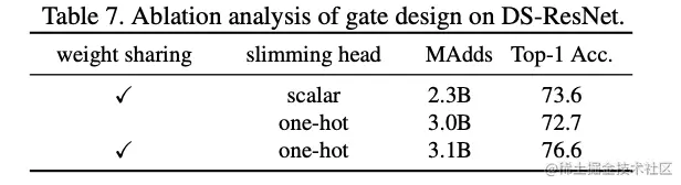 在stage II训练中,论文使用分类交叉熵损失和复杂度惩罚函数来端到端地训练门控,引导门控为每个输入图片选择最高效的子网。为了能够用来训练不可微的slimming head,论文尝试了经典的gumbel-softmax方法,但在实验中发现门控很容易收敛到静态的选项,即使加了Gumbel噪声也优化不了。