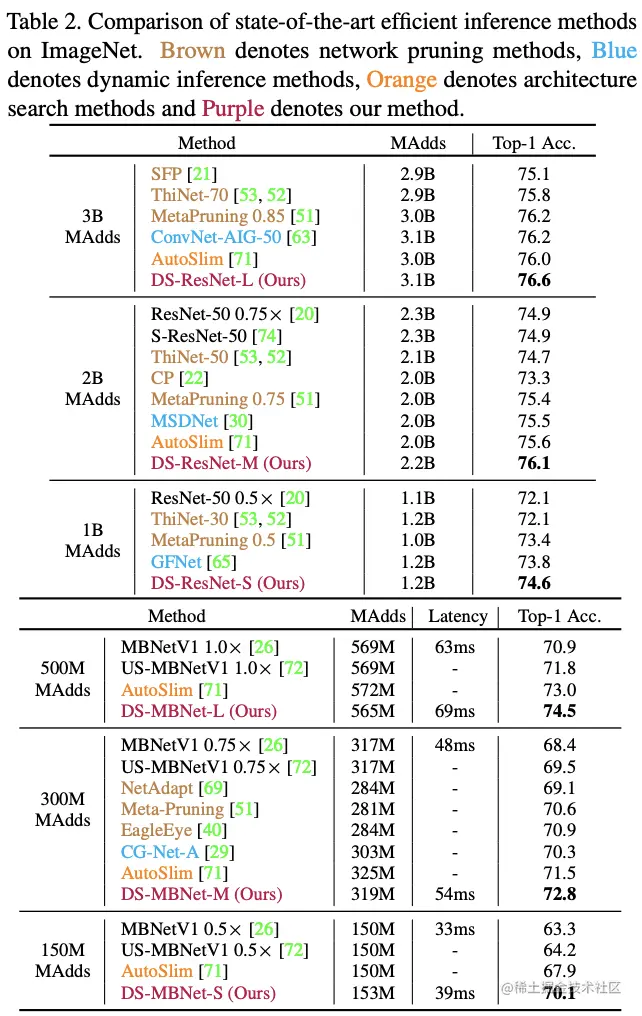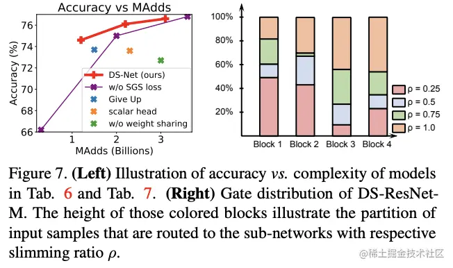 - 通过ImageNet实验对比,DS-Net的整体性能比SOTA动态网络高约5.9%,比ResNet和MobileNet等静态网络性能稍微下降,但是有2-4倍计算量节省以及1.62倍实际推理加速。
