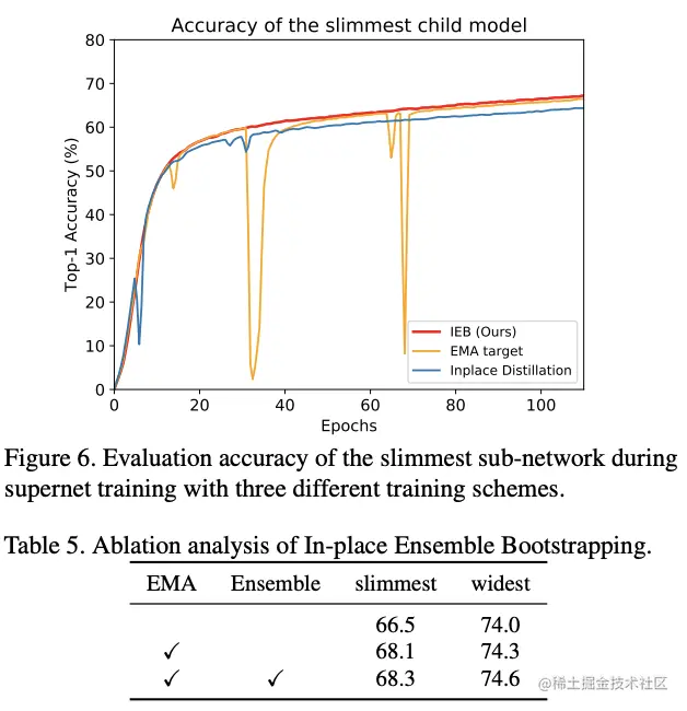 虽然in-place distillation很有效,但最大子网权值的剧烈抖动会导致训练难以收敛。根据BigNas的实验,使用in-place distillation训练较为复杂的网络会极其不稳定。如果没有残差连接或特殊的权值初始化,在训练初期甚至会出现梯度爆炸的情况。为了解决可精简网络收敛难的问题并且提升整体性能,论文提出了In-plcae Ensemble Boostrapping(IEB)方法。