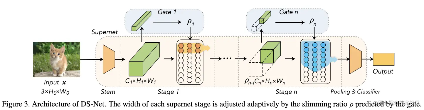 论文提出的dynamic slimmable network通过学习可精简的超网(supernet)以及动态门控(gating)机制,达到根据不同输入样本动态生成网络的目的。如图3所示,DS-Net的超网为包含全部完整卷积的完整网络。动态门控则是一系列预测模块,根据输入动态设定每个阶段的卷积维度,进而生成子网,这一过程也称为动态路由(dynamic routing)。