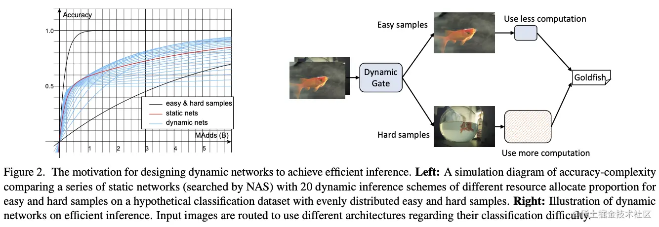 模型速度在模型的移动端应用中十分重要,提高模型推理速度的方法有模型剪枝、权值量化、知识蒸馏、模型设计以及动态推理等。其中,动态推理根据输入调整其结构,降低整体计算耗时,包含动态深度和动态维度两个方向。如图2所示,动态网络自动在准确率和计算量之间trade-off,比静态的模型设计和剪枝方法要灵活。