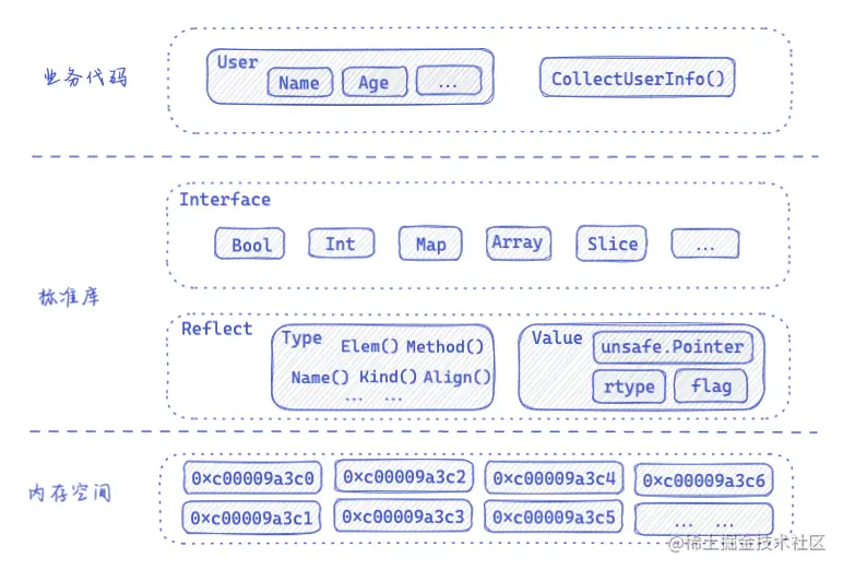 Golang中数据类型是多样、复杂的,它通过定义通用的数据结构和组织方式将复杂类型从朴素的内存空间的存储单元中抽象、拼装出来,具体存储的位置和数据类型是无关的,只关乎于数据是否匹配预先设置的格式空间要求,一旦满足即可完成内存到丰富数据表现的转换能力!interface{}更面向对象角度便于开发者使用和操作,更偏向于上层,无需关心字符串、数值、布尔这些数据类型是如何存储和内存转换的,直接操作这些”成品“即可;而reflect更面向数据存储、内存映射便于裸数据到具体上游数据类型的转换,更偏向于底层,这些数据组织方式更像是半成品,还有很多可塑和操作空间。reflect提供了TypeOf、ValueOf方法与interface{}进行转换和数据交互。 -