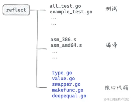 源码之下无秘密。这里基于Go1.16深入源码之中结合注释内容进行层层剖析!reflect包下内容可以大体分为三部分:测试文件、编译文件、反射核心代码,这里主要围绕核心代码展开。