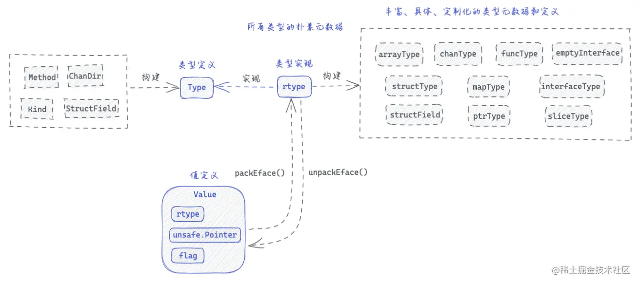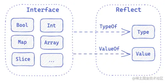 interface{}保存一个值,通过调用TypeOf获取其动态类型信息,该函数返回一个Type类型值。 - 调用