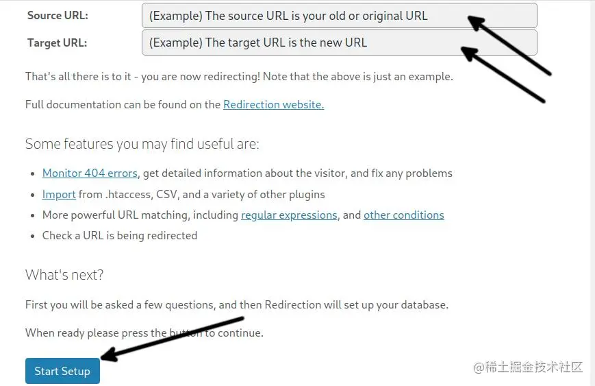 该插件的第一个屏幕将显示两个字,用于设置重定向的源页面和目标页面。如果你只有一个页面要重定向,你可以现在输入它,然后按开始设置;如果你有很多页面,你可以忽略这一点,按 开始设置按钮。