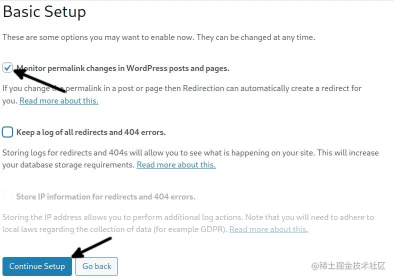 你也可以指示该插件保留404错误的日志。作出选择,然后按 继续设置按钮。