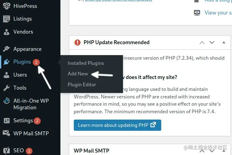 要从仪表板上重定向WordPress的URL,你需要安装一个插件。在本教程中,我选择了一个名为Redirection的插件。要在左边的菜单上安装它,选择 插件,在显示的子菜单中,按 添加新的如下面的屏幕截图所示 (插件>添加新的).