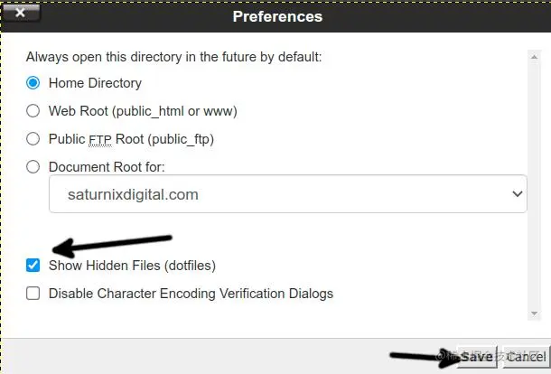 确保 "显示隐藏文件(点状文件)"选项被选中,并按下 保存 按钮。