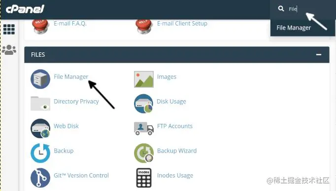 如果使用Cpanel,找到下面屏幕截图中显示的文件管理器。你可以使用搜索栏来输入 文件 并快速找到它。