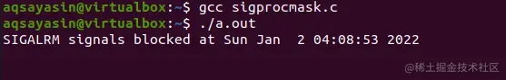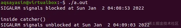在编译和运行该文件后,它向我们显示了报警信号集被封锁的时间。几秒钟后,捕获器函数被调用,另一条语句显示了报警信号集释放的解除阻塞时间。