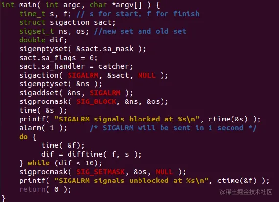 主要的执行从我们代码的main()函数开始。它包含两个参数。首先,我们通过 "time_t "关键字利用时间结构 "s "表示开始,"f "表示结束。结构sigaction被声明为 "sact",用于设置自然界中做某事的信号。"sigset_t "结构用于声明两个信号集,即 "ns "表示新的信号集,"os "表示旧的信号集。双重类型变量 "dif "被声明。首先,sigemptyset函数用于初始化 "sact "结构的信号掩码并排除所有信号。sa_flags处理程序被用于sigaction的比特掩码,并被初始化为零。sa_handler "被用来声明 "catcher "函数作为使用 "sact "sigaction对象的信号处理。sigaction函数在这里被调用,使用SIGALRM为信号 "sact "设置报警。