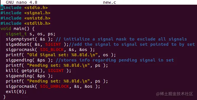 我们在 "nano "编辑器中开始了我们的代码,包括一些必要的C头文件。这些头文件可能是最常见的头文件,如 "stdio.h"、"unistd.h "和 "stdlib.h"。除此之外,最重要的头文件 "signal.h "也被添加进来,以利用C代码中的信号处理功能。所有的工作都已经在这个程序的main()方法中完成。因此,在启动该方法后,我们使用 "sigset_t "对象初始化了一些信号构造变量,即s、os和ps。s "代表信号,"os "代表一个原始信号集,"ps "代表一个待定的信号集。