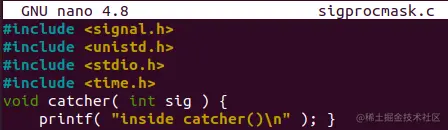 让我们看看另一个例子,"sigprocmask "函数是C语言中用来封锁和解除封锁的特定信号集。所以,我们添加了一个新的文件并尝试了新的代码。首先,你需要在代码文件中添加相同的头文件,如下图所示。用户定义的 "catcher "函数在这里只是显示我们在这个函数里面,使用其printf函数。