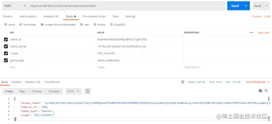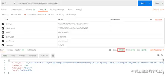 1.从用户管理网站获取密码访问令牌(URL:http//xa-dd3-bks:22345/UserService/connect/token)。