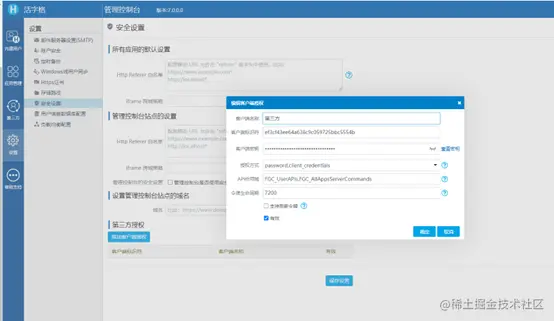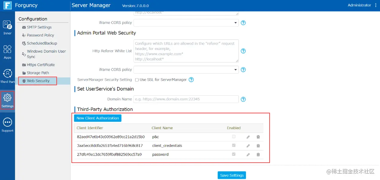 首先需要授权设定,登录管理门户网站,然后单击设置→Web安全性页面,如下所示,管理员可以为每个第三部分配置客户端标识符和密码。
