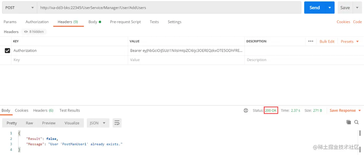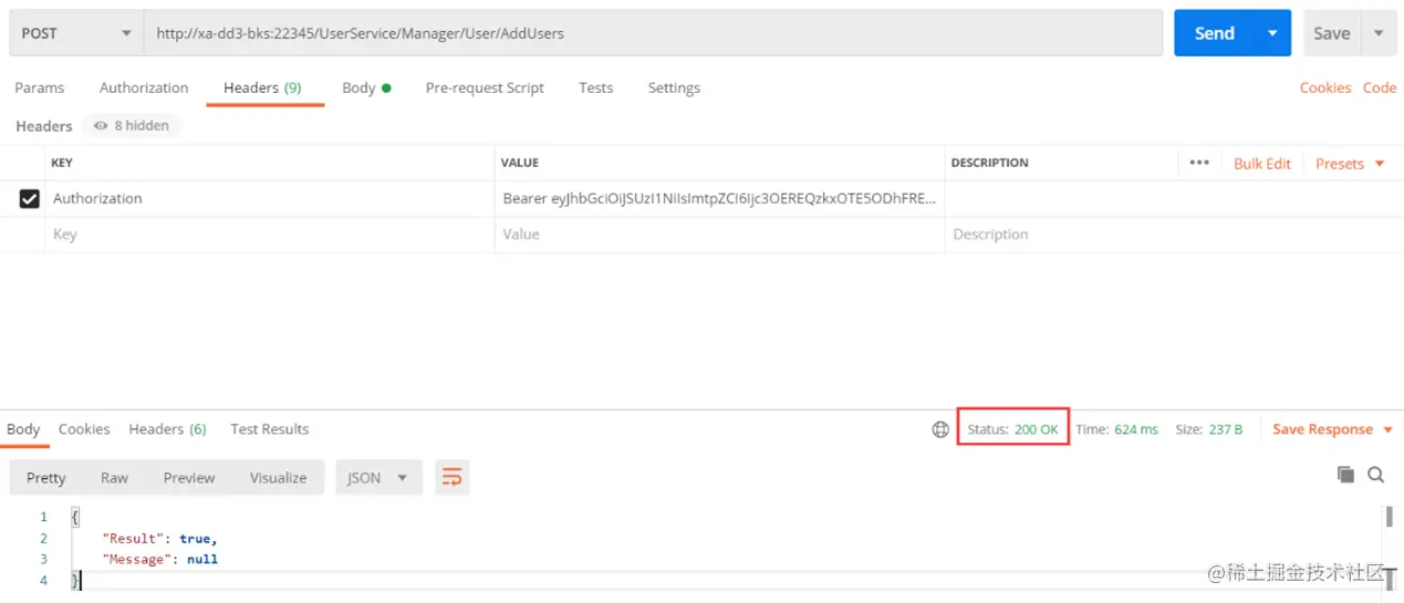 2.添加具有访问令牌的用户。(状态:200 OK)