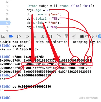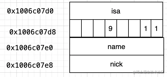 从地址的打印结果中可以看出,age、isGirl、isBoy三个属性被放在了一起,苹果的确进行了自动属性重排,以优化内存。