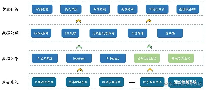 以民航为例,旅客选择飞机出行需要经历订票、值机、登机等一系列流程,每种业务处理都要跨越多个平台的应用系统,每个系统都会实时输出日志数据记录当前应用运行情况,上述流程中任何一个应用的故障或者性能问题都会影响乘客出行。