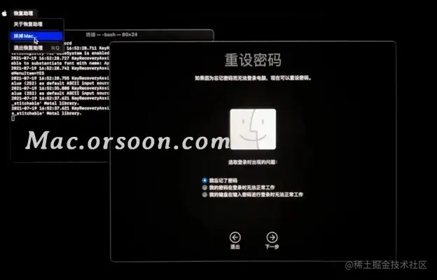 在顶部的实用工具中选择“终端”,输入“resetpassword”按回车。点按“重设密码”窗口以将它前置,然后从菜单栏中选取“恢复助理”,“抹掉 Mac”。完成后,Mac将会自动重新启动。