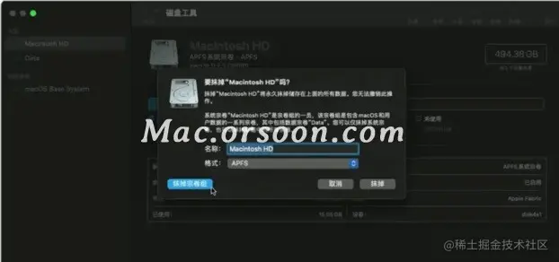 在“磁盘工具”边栏的“内置”部分中,找到名为“Macintosh HD”的宗卷。选择“Macintosh HD”,点按右上角工具栏中的“抹掉” ,然后修改名称为“Macintosh HD”、格式为“APFS”再点击“抹掉宗卷组”(如果没有则点击“抹掉”)。抹掉数据后将自动重启。