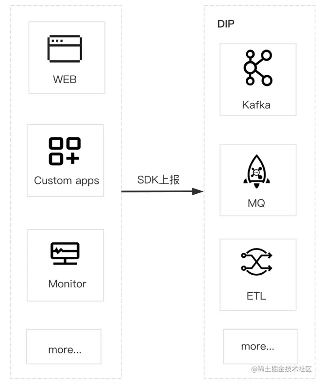 DIP 旨在用 SaaS 化的思路解决这个问题,目标是通过如下两步:界面配置、SDK 上报,完成整个链路的搭建,并基于 Serverless 理念,以按量计费,弹性伸缩,无需预估容量等方式,简化客户的研发投入成本和实际的使用成本。