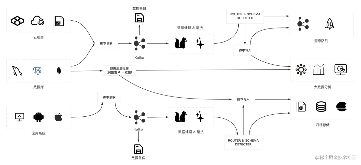 下图是一个非常经典的数据链路的架构图。从左到右,依次是数据源、数据接入层、数据缓冲层、数据分发层、数据目标,可以看出,搭建一个完整的数据链路非常复杂繁琐。