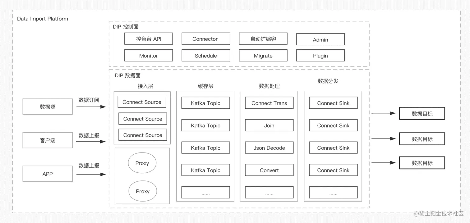 DIP的核心还是数据面的,下图是DIP系统架构图:可以看到根据数据流转的链路,分为数据接入、数据处理、数据流出三大块。