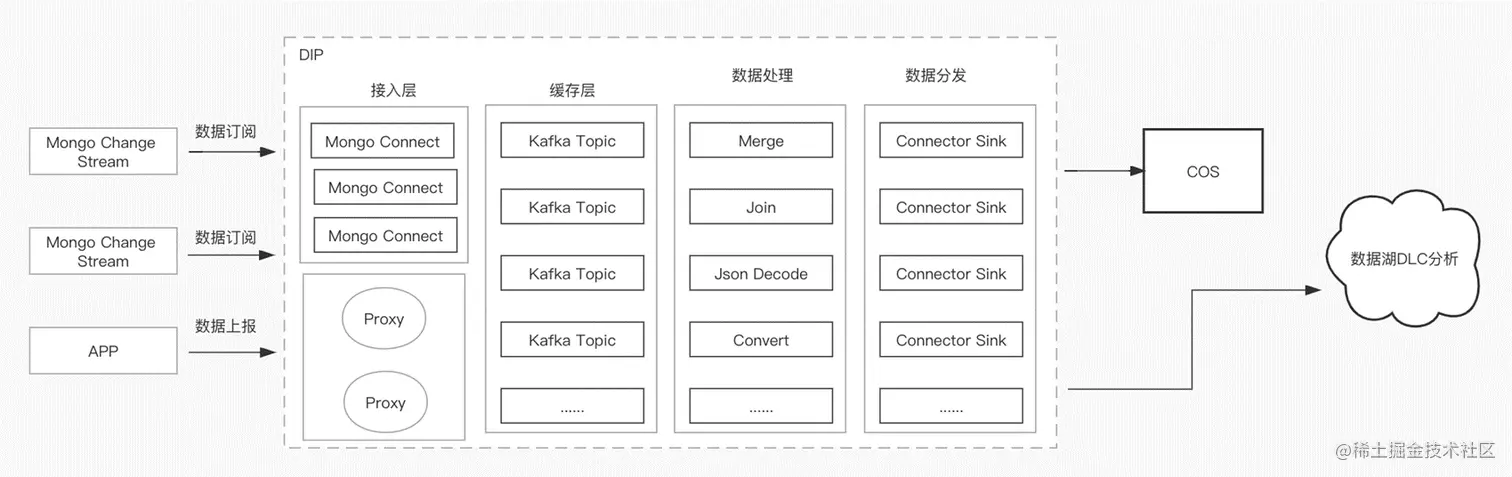 DIP是由腾讯云上CKafka孵化出的数据接入产品,底层基于开源Kafka Connector和自研接入分发层。从本质上来看,Kafka是消息队列,属于存储产品。而DIP是数据接入分发平台,定位为存储层(MQ)的上下游数据连接。