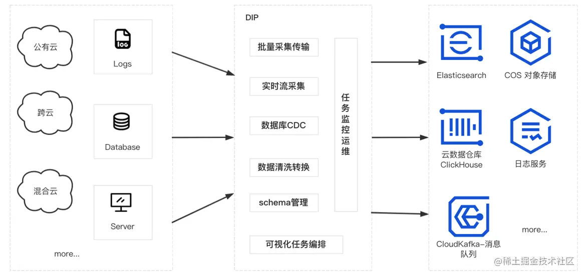 DIP 支持将不同环境(腾讯公有云、用户自建 IDC、跨云、混合云等)的不同数据源(数据库、中间件、日志、应用系统等)的数据集成到公有云的消息队列服务中,以便进行数据的处理和分发。