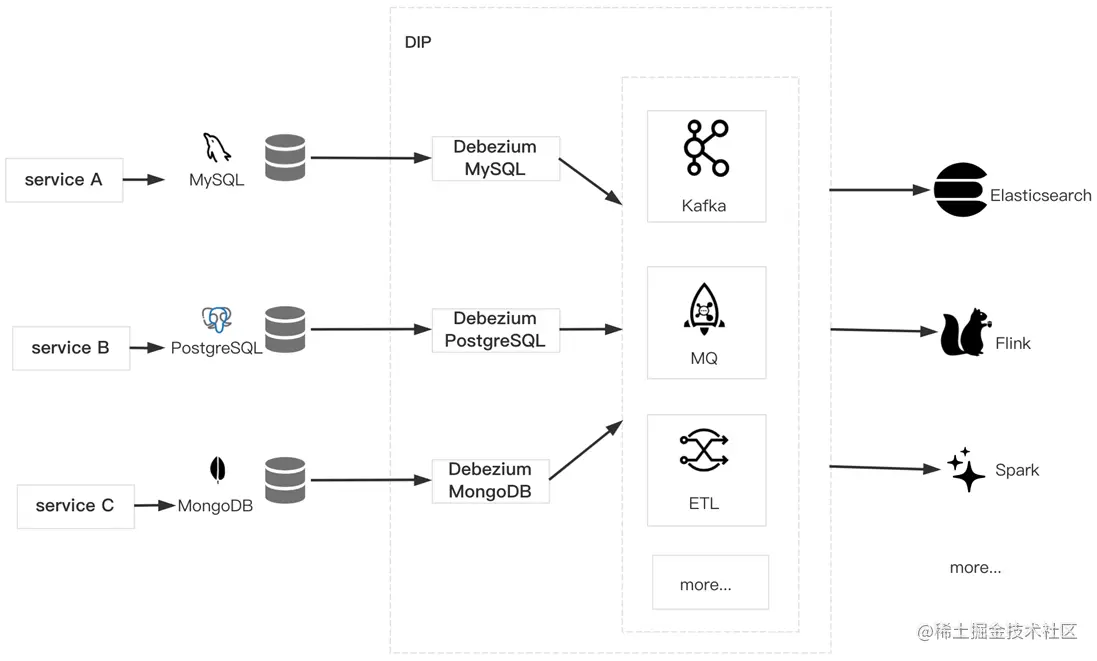 DIP类似于传统大数据解决方案中Kafka+Flink的角色,提供了通用的数据连接、处理、流转的功能。核心诉求是希望可以协助客户低成本的搭建整条的数据链路。根据二八原则,DIP希望解决大部分通用的数据连接场景。而对于业务属性强,逻辑复杂的还是需要依赖Flink等流式计算引擎来实现。