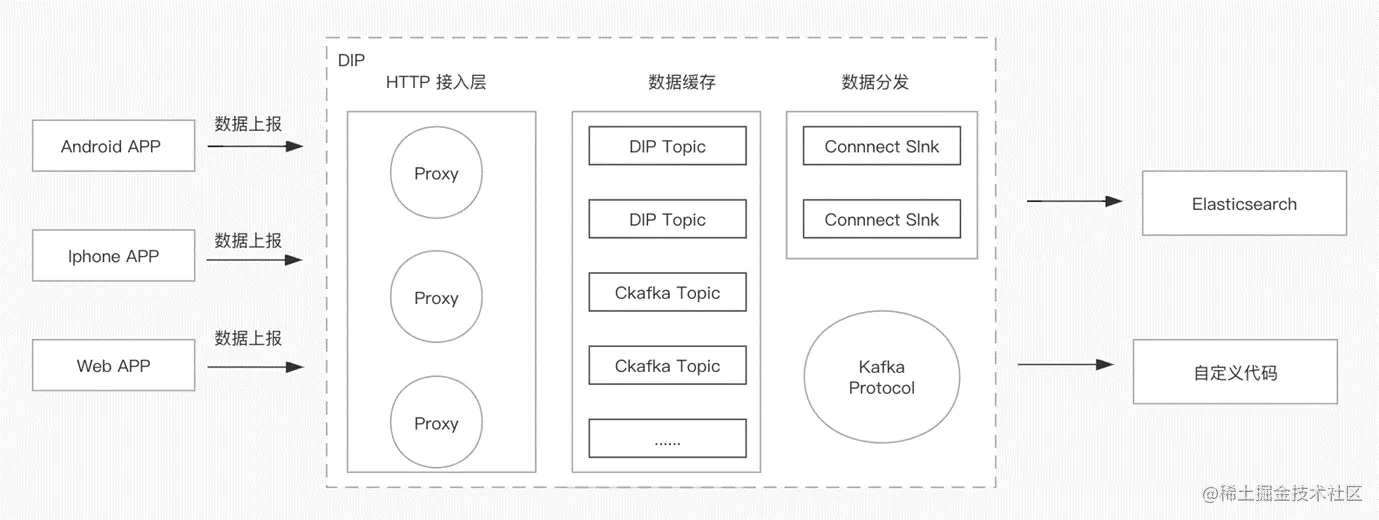 从技术上看,这部分工作通用性很高,DIP可以满足这种场景,提供稳定、弹性、高可靠、高吞吐的数据接入服务。客户可以通过Android、iphone、web这些客户端在我们的SDK把数据直接放到DIP中,DIP目前的缓冲层有两种形态。如果客户用量较大,可以买一个Kafka集群,选自己的topic,不需要为存储付费。量比较小的话也不需要买整个Kafka集群,只需要买单个topic,按量付费。然后进行数据分发,建一个sink,存到es。第二部分会自定义代码,把Kafka协议拿下,这样整个研发成本都可以降下来。