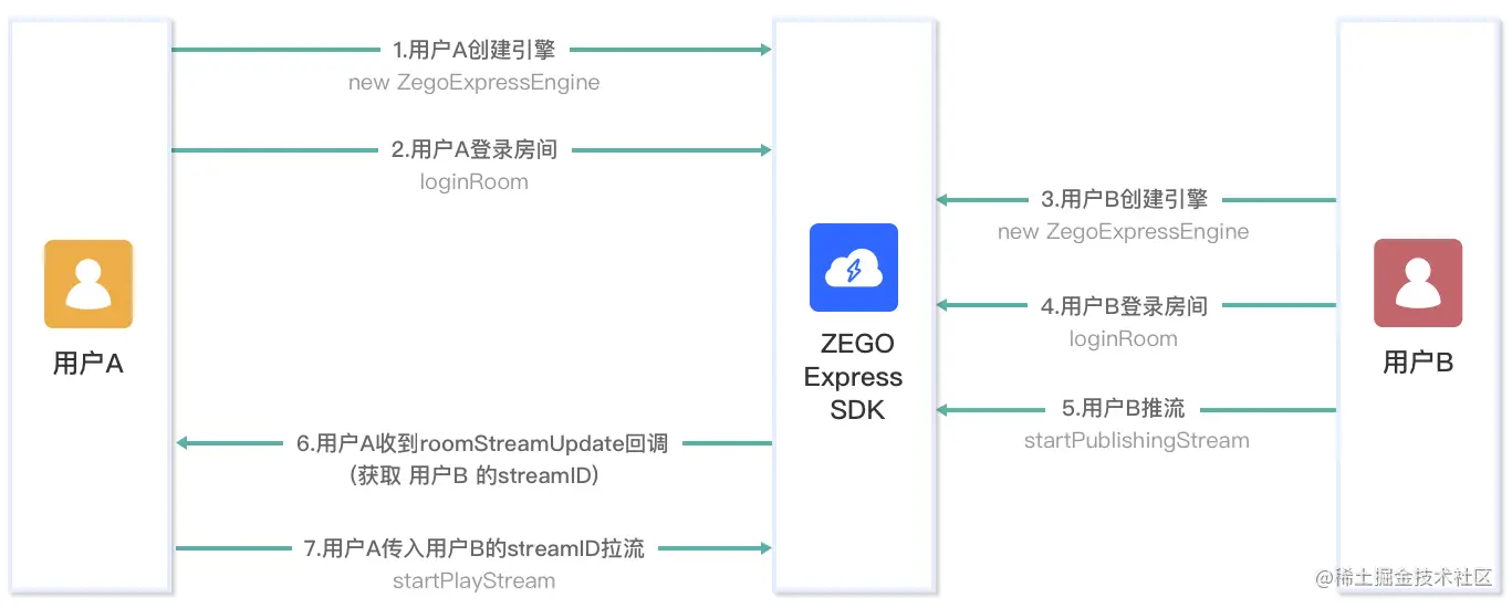 以用户 A 拉取用户 B 的流为例,流程如下图: