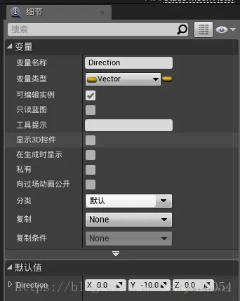 同样方法设置Direction变量,类型为“Vector”型,点击勾选“可编辑实例”,编译后设置默认值(此处的默认值是物体移动时的方向,可根据需要设置)。